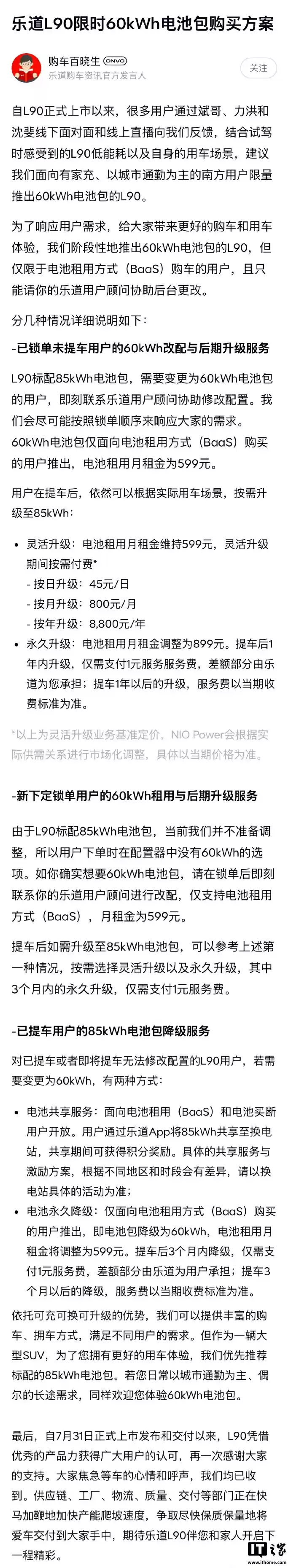 8月11日,乐道汽车发布公告称,乐道L90车型现已开放60度电池包选配。对于已锁单但尚未提车的用户,可联系客服顾问申请配置变更。需要注意的是,此项改配服务仅面向采用电池租用方式(BaaS)购车的用户,**电池租用月租金定为599元**。
