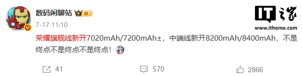 值得一提的是,该博主早些时候曾透露荣耀旗舰产品线正在研发7020mAh/7200mAh±规格的电池,中端机型则规划了8200mAh/8400mAh的电池方案,**并且他特别强调“这还不是最终上限”**。