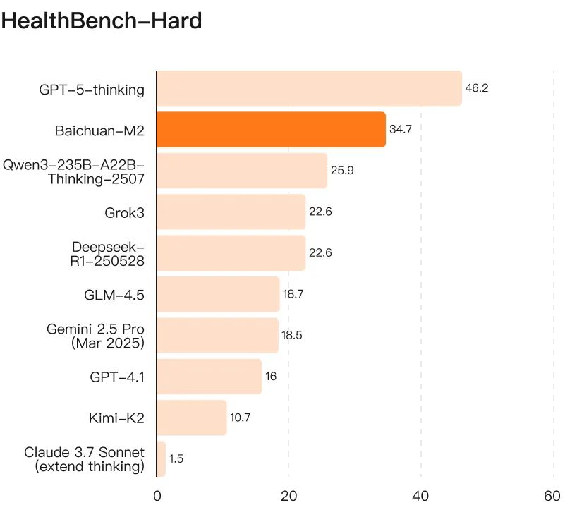 此外,Baichuan-M2 号称在医疗复杂问题方面的能力比肩 GPT-5,超越一众顶尖闭源大模型。GPT-5 发布时,OpenAI 特别强调,其是 HealthBench Hard 评测全球唯一超过 32 分的模型。Baichuan-M2 则以 34.7 分成为全球第二款超过 32 分的模型。