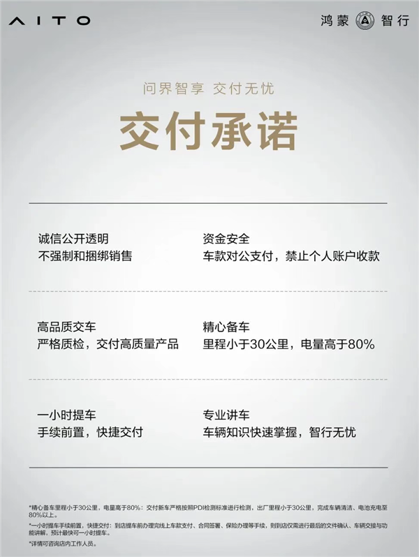 为了践行新豪华交付理念,持续提升交付标准与品质,我们正式推出6项交付承诺。