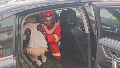 征得家属同意后,消防员立即用破拆工具破窗,迅速打开车门将孩子安全抱出,所幸孩子只是受了惊吓,身体并无大碍。