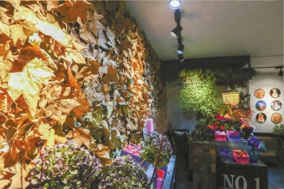 其实这家店铺面积不大,只有30平方米,连大门都是小小的,沿街只有几扇窗户可以一窥究竟。店铺迅速蹿红的原因和落叶密不可分。11月下旬,武康路上的梧桐树开始逐渐飘落,此时,该店铺尚未正式营业,正在进行最后的软装饰。黄煌从人行道上密密麻麻的落叶中获得灵感,与花艺师们从地上一片片拾起梧桐落叶,然后用胶枪细心地将它们贴在靠近大门的墙上,以数千片梧桐叶,为花店内增加了一堵充满层次感、色彩缤纷的落叶墙。