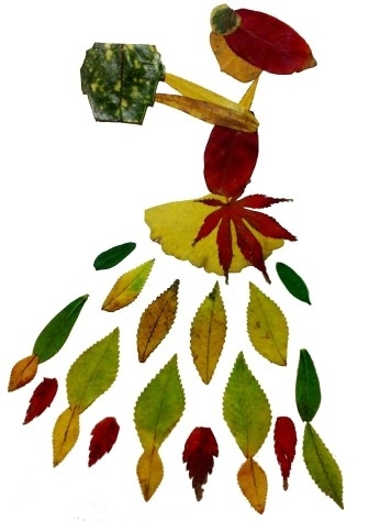 在一张印有模特肖像的卡纸上,根据自己的构思,将树叶按一定顺序粗略摆放,随后再精细调整;完成后的作品可以拍照保存。或者在树叶背面蘸上胶水或双面胶,黏贴保存。