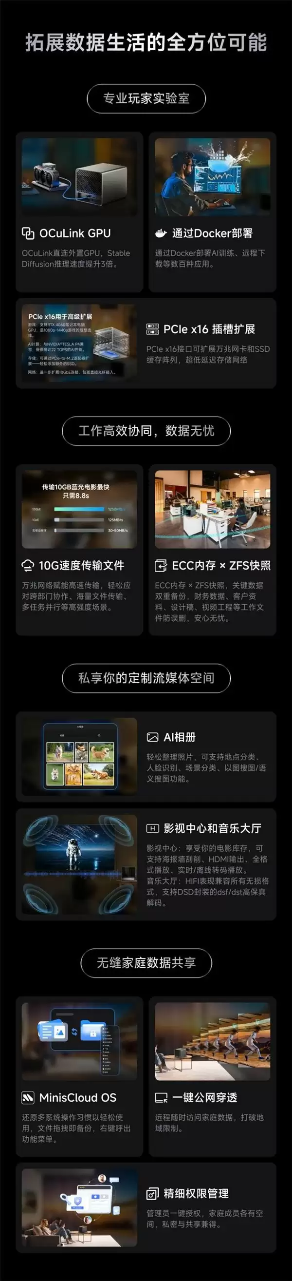 N5 Pro作为市面上罕见的高性能NAS解决方案,不仅适用于家庭存储需求,更能胜任生产力工具、虚拟化环境搭建、多媒体娱乐等多种应用场景,真正实现一机多用的全能体验。