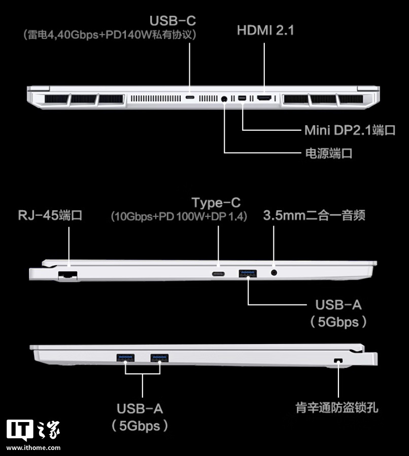 I/O 方面,该机左侧提供 1 个 RJ45 网口、1 个 USB-C 10Gbps 接口、1 个 USB-A 5 Gbps 接口;1 个 3.5mm 音频接口;右侧提供 2 个 USB-A 5Gbps 接口;后置 1 个雷电 4、1 个 HDMI 2.1、1 个 Mini DP 2.1 接口。