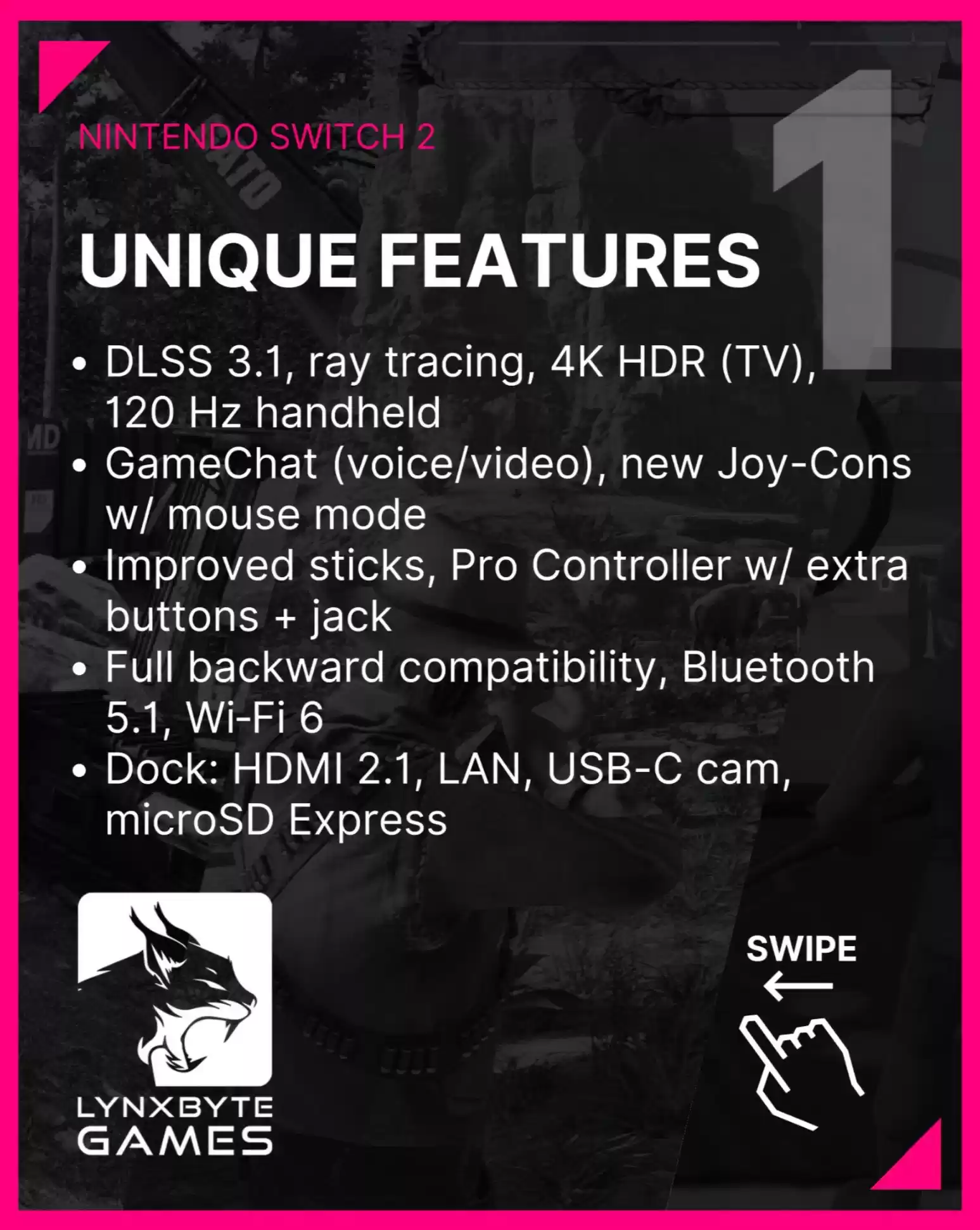 此外,Lynxbyte Games 在领英发布的图片还显示 Switch 2 游戏机具备 DLSS 3.1 帧生成功能,具备光线追踪、4K HDR(底座模式)、120Hz(手持模式)等特性。