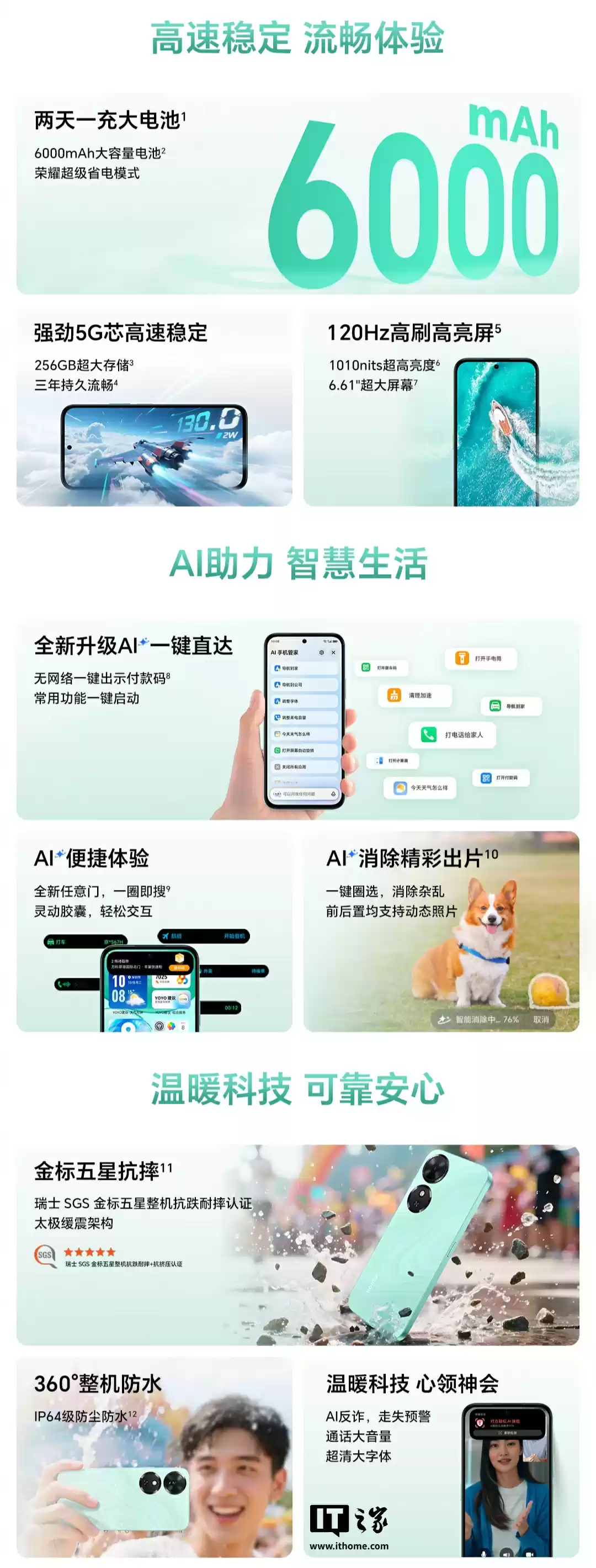 8 月 12 日消息,荣耀 Play10C 手机今日起正式开售,新机搭载联发科天玑 6300 处理器、内置 6000mAh 电池,支持 IP64 级防水,定价 649 元起、国补到手价约 551.65 元起。