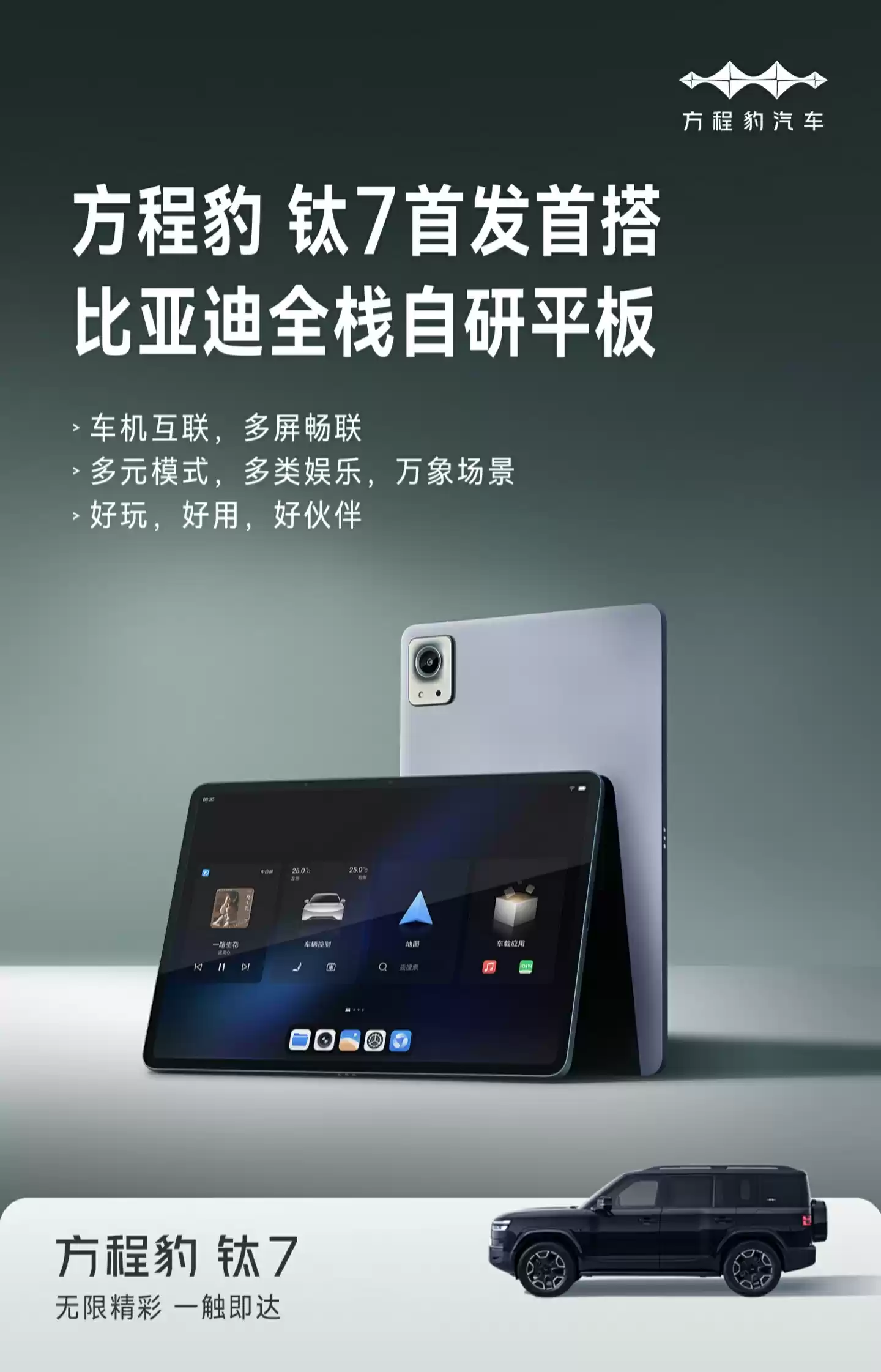 8 月 12 日消息,比亚迪方程豹汽车今日发布预热消息,方程豹钛 7 车型将首发搭载比亚迪全栈自研平板。