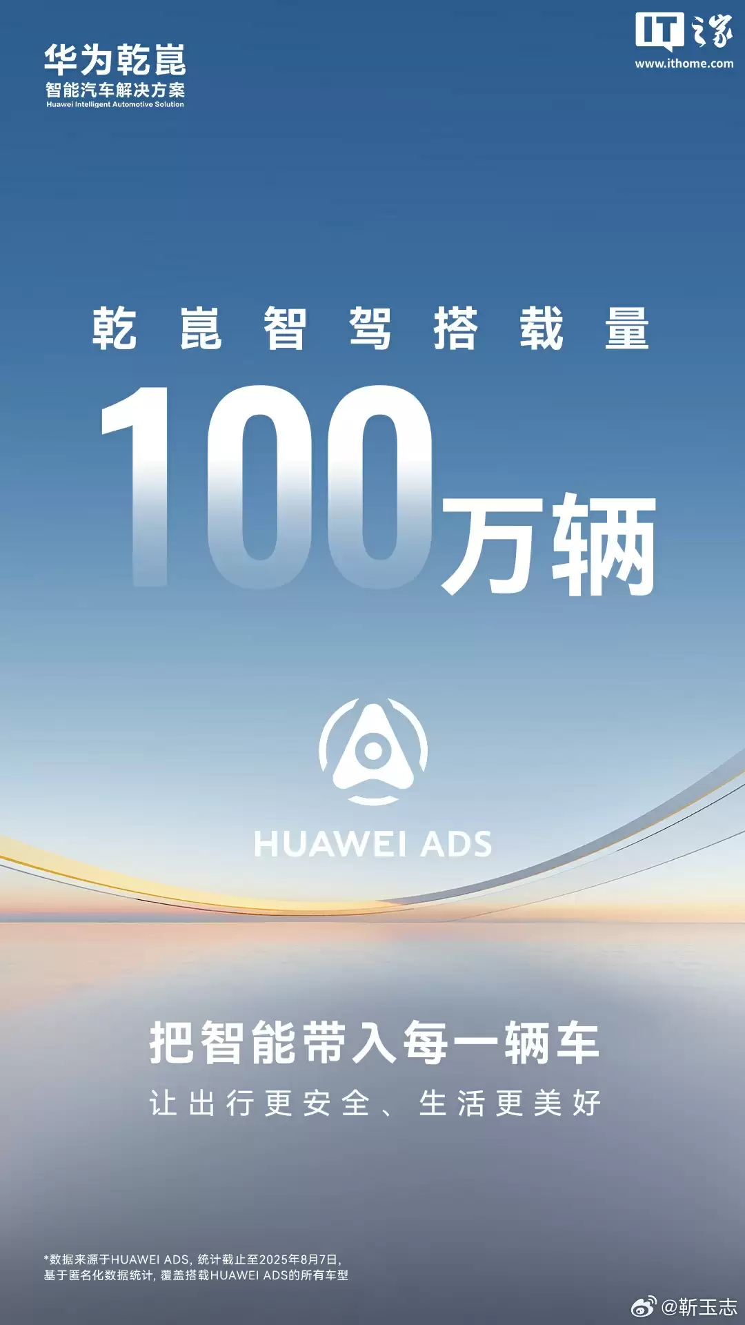 8月12日最新消息,华为智能汽车解决方案BU CEO靳玉志通过官方微博宣布了一个振奋人心的数字:华为乾崑智能驾驶系统装机量正式突破100万辆大关。