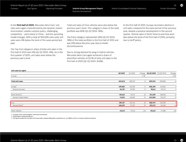 就拿奔驰来说,今年上半年,奔驰在北美累计交付 15.75 万辆,同比下滑 6%,而在亚洲这个奔驰最大的市场,交付量只有 38.9 万辆,同比下滑 16%(其中中国 29.32 万辆,同比下滑 19%)。