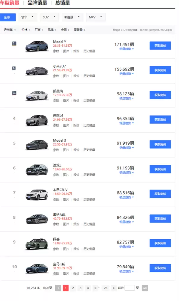 再看前排,几乎全是新能源车型,特斯拉、小米、鸿蒙智行们吃的就是他们的份额。