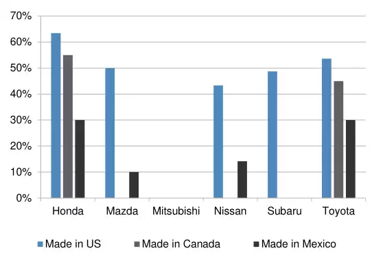 原因也很简单,日本车受关税的影响比较小,早在 2020 年,本田在美国的国产化率就已经高达 80%(最近几年有下滑),丰田也接近 60%。