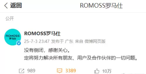 7月3日,罗马仕通过官方微博发布声明称:“公司并未倒闭,感谢各方关心。我们将全力解决所有朋友、用户及合作伙伴提出的各项问题。”