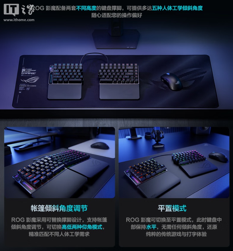 据介绍,华硕 ROG 影魔键盘采用分离式设计,可在游戏时只使用左边键盘,并通过 2.4GHz 连接至电脑,支持 8000Hz 回报率。键盘配备两套不同高度的撑脚,可提供五种人体工学倾斜角度。