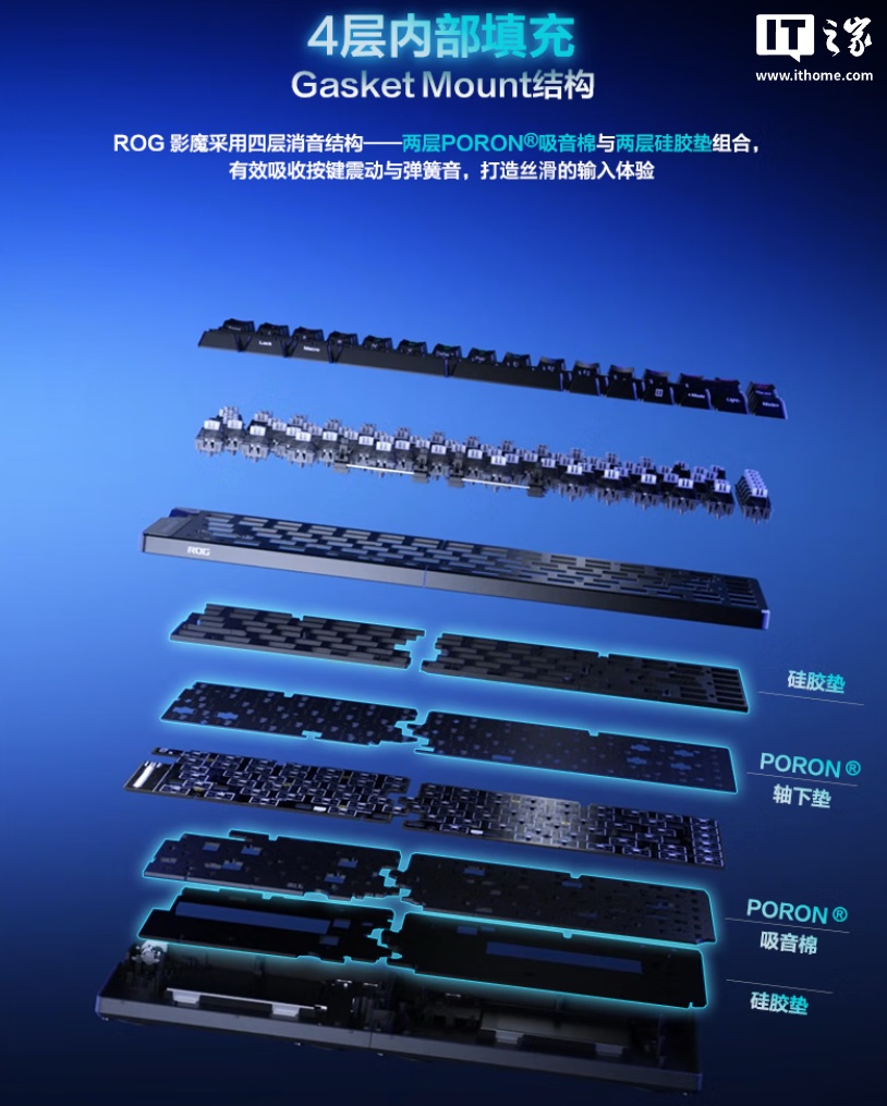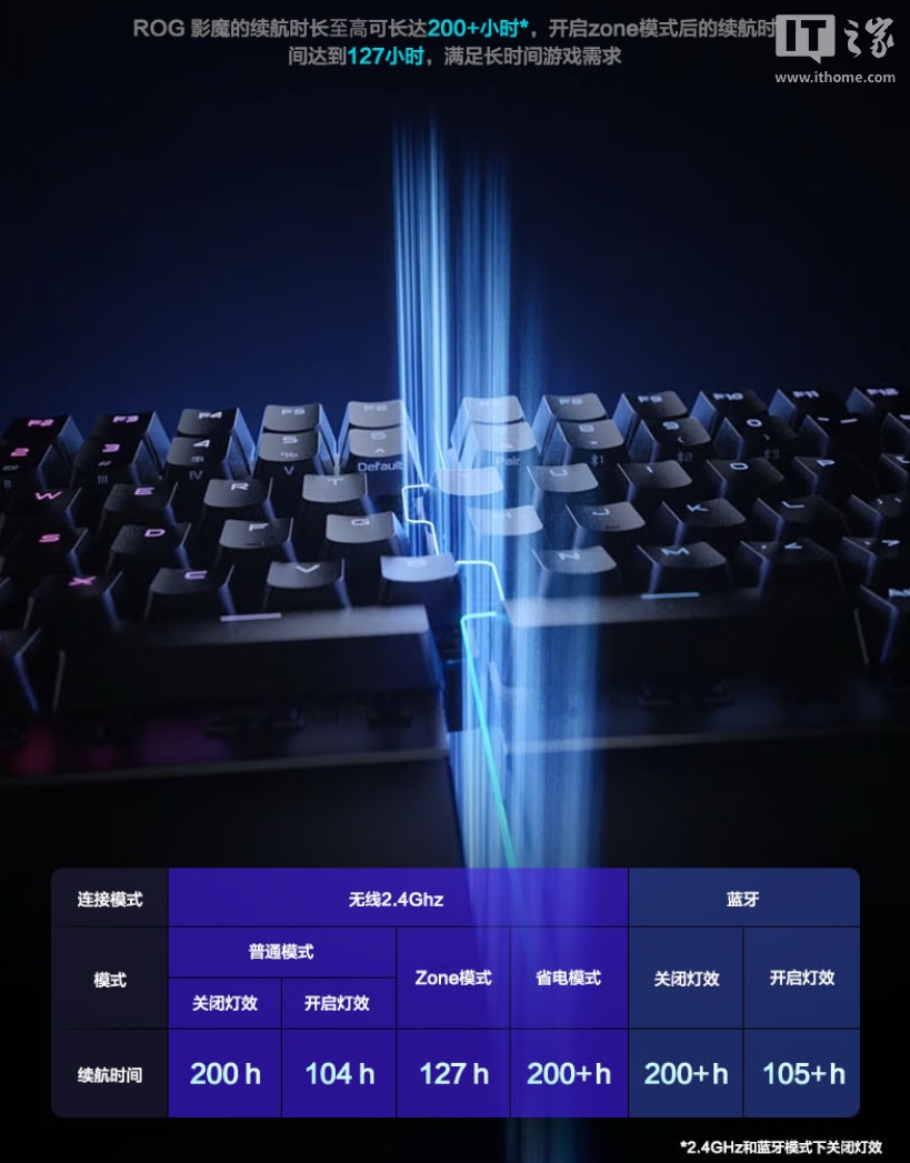 华硕 ROG 影魔 75% 分离式键盘采用新一代 Nordic 54H 主控、支持 SpeedNova 8K 无线技术 + 三模连接,续航至高 200+ 小时(Zone 模式续航时间约 127 小时)。键盘还采用 4 层消音结构、配备双色注塑 PBT 键帽。