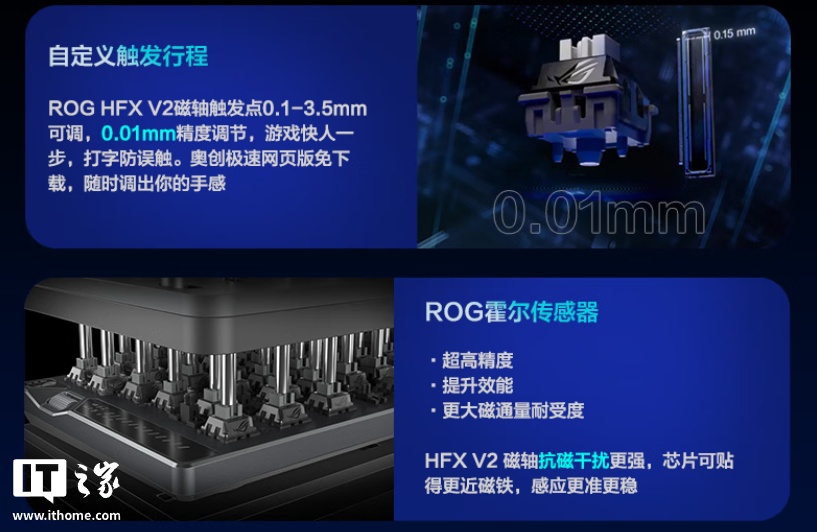 新品键盘搭载全新 ROG HFX V2 第二代磁轴,轴芯与底壳选用 POM 材质,按键寿命达 1 亿次。HFX V2 磁轴还支持自定义触发行程,可实现 0.1mm 精度调节。