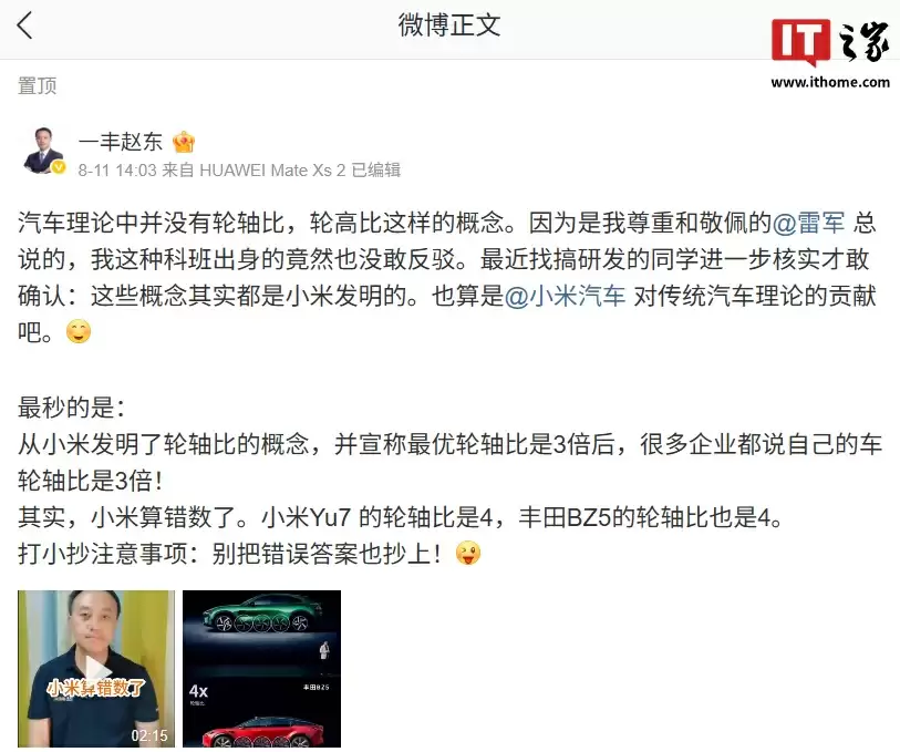此前,一汽丰田汽车销售有限公司企划部部长“一丰赵东”曾对小米汽车宣传中使用的“轮轴比”概念提出质疑。赵东指出,小米在介绍YU7车型时宣称其轮轴比达到3倍,这一计算结果存在争议。