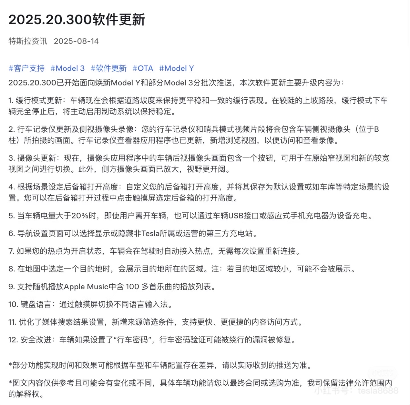 8月14日最新消息,特斯拉官方宣布,2025.20.300版本软件更新已正式启动,首批面向焕新版Model Y及部分Model 3车型用户进行分阶段推送。