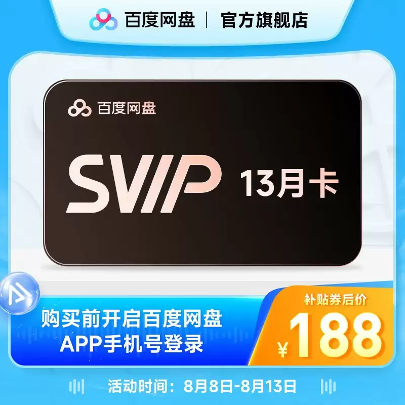 京东百度网盘 SVIP 13 月卡超级会员年卡 + 月卡券后 188 元领 10 元券注:现购买权益时长 + 已有权益时长,不能超过 5 年,否则会充值失败。