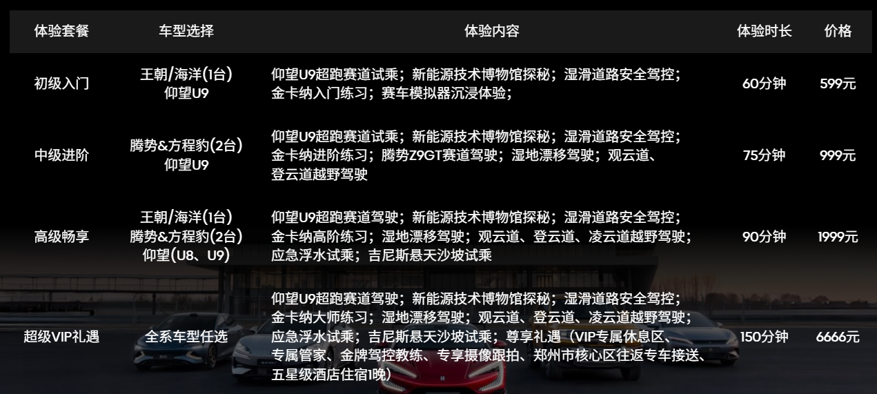 超级VIP礼遇 | 全系车型任选 | 仰望U9超跑赛道驾驶;新能源技术博物馆探秘;湿滑道路安全驾控;金卡纳大师练习;湿地漂移驾驶;观云道、登云道、凌云道越野驾驶;应急浮水试乘;吉尼斯悬天沙坡试乘;尊享礼遇(VIP专属休息区、专属管家、金牌驾控教练、专享摄像跟拍、郑州市核心区往返专车接送、五星级酒店住宿1晚) | 150分钟 | 6666元 |