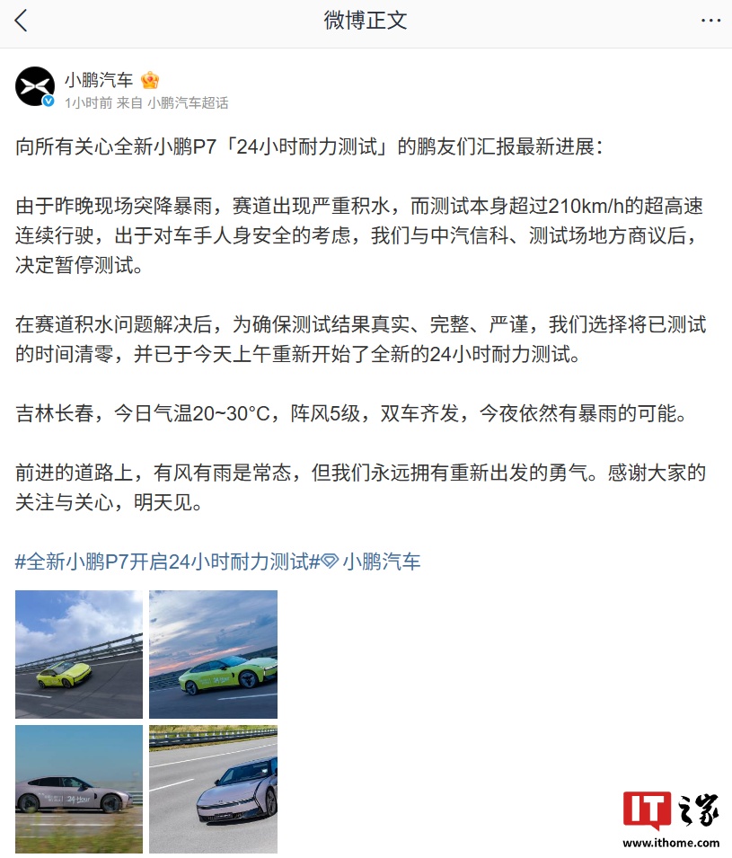 据今日早些时候报道,小鹏汽车动力总成高级总监 @XP-Jacky 今天凌晨 2 时许分享了全新小鹏 P7 的 24 小时耐力测试进展:现场突发恶劣天气,赛道积水严重。若持续高速测试,则安全风险极大。在充分考虑测试车手人身安全的前提下,小鹏汽车、中汽中心及场地方讨论后决定暂停测试。