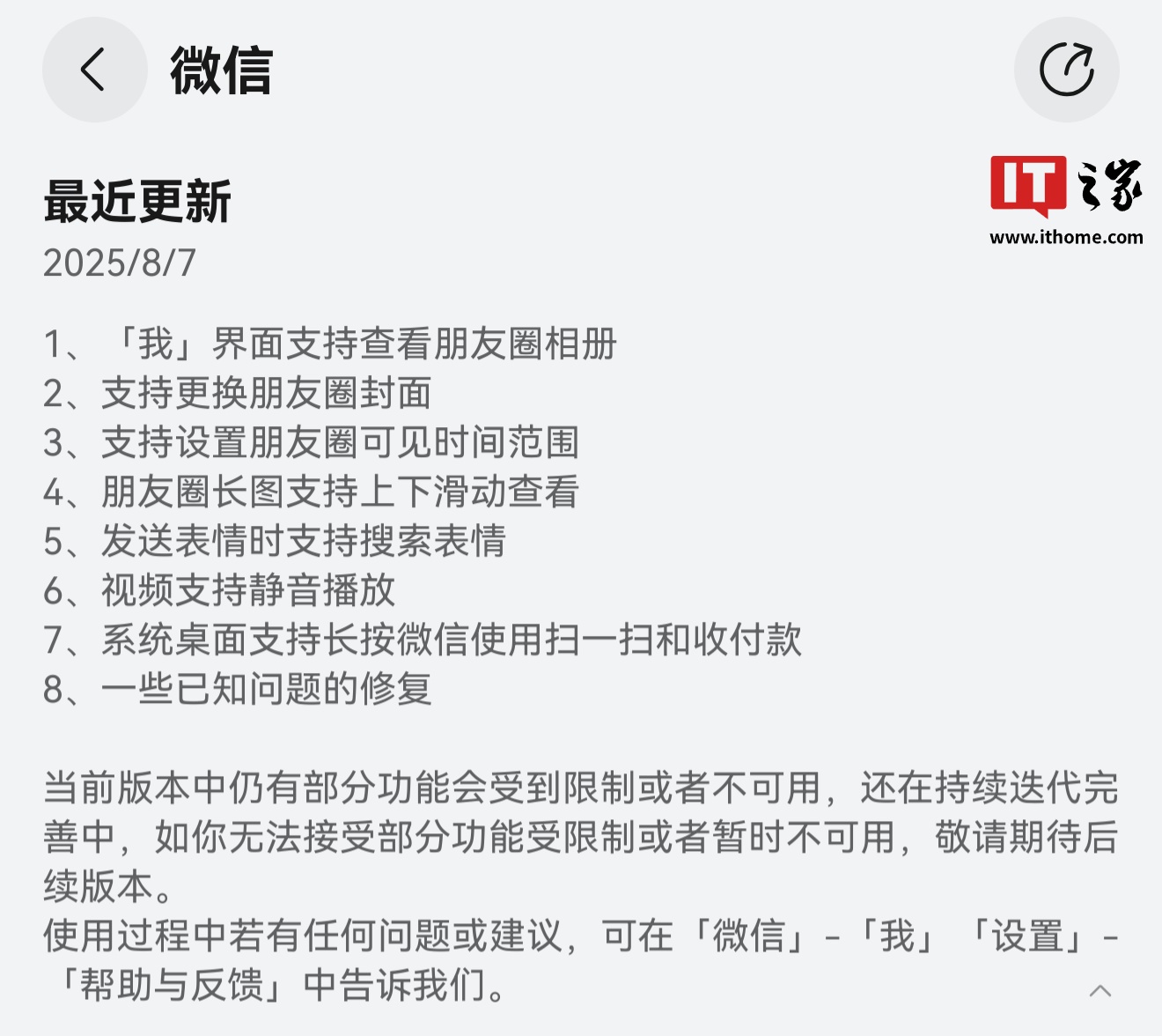值得注意的是,本次测试版本的更新说明较以往更为简洁,仅标明"修复若干已知问题",这种表述风格与安卓和iOS版本的更新说明保持了一致。当前微信鸿蒙版正式版仍为1.0.9.36版本,其完整更新内容包含: