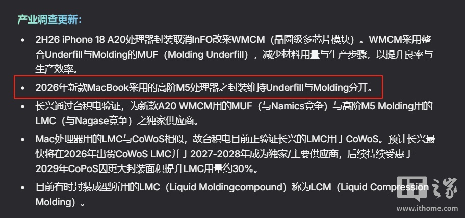 不过郭明錤同时指出,2026年问世的高端M5芯片系列(包括M5 Pro和M5 Max)在生产流程中仍将保持独立的填充与成型工艺。他特别强调2026年这个时间点具有重要意义,因为早前业界曾传闻搭载M5芯片的MacBook Pro将于2025年底发布。值得注意的是,上个月彭博社知名记者马克・古尔曼也曾报道,苹果正在"考虑"将下一代M5系列芯片的MacBook Pro发布时间推迟至2026年。