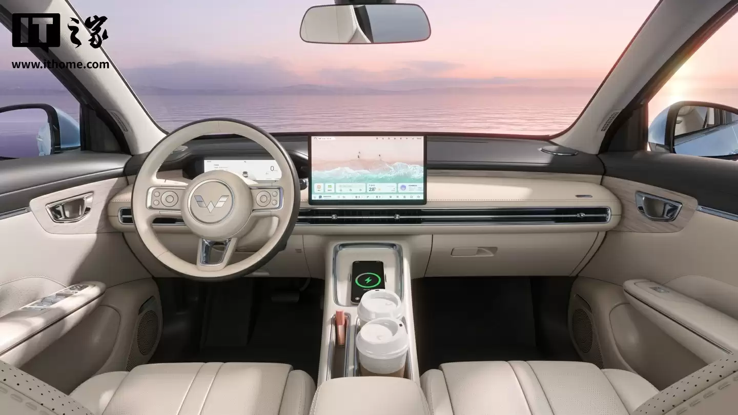 注意到,从内饰官图来看,五菱缤果 S 采用了环抱式座舱布局,营造出温馨且富有科技感的驾乘氛围,提供柔白和暖棕两种配色方案。在配置方面,新车搭载了多功能方向盘,配备 8.88 英寸全液晶嵌入式仪表和 12.8 英寸高清触控大屏。贯穿式内嵌空调出风口设计简洁时尚,与整体内饰风格相融合。此外,新车采用怀挡式换挡机构。在副仪表台位置,新车还配备了 50 瓦风冷手机无线快充功能。