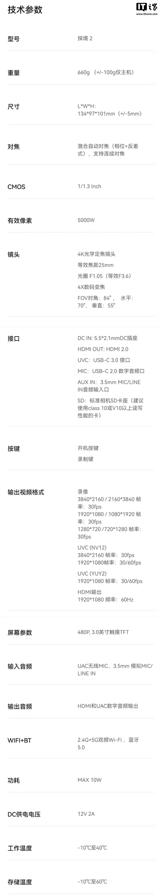 在硬件配置上,探境2进行了全方位升级:配备1/1.3英寸大底传感器,搭配F1.05超大光圈镜头,支持4K 30fps高清电脑直播输出,3英寸480P触控屏让操作更为便捷。