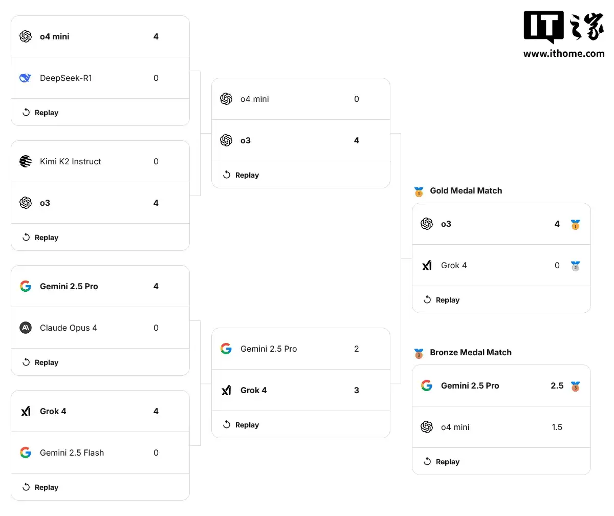 8 月 14 日消息,在上周举行的“人工智能国际象棋表演赛”中,OpenAI 的 o3 模型以出色的表现赢得了冠军,在决赛中战胜了 xAI 的 Grok 4。此次比赛在谷歌旗下的 Kaggle 平台举办,共有八个 AI 模型参与角逐,经过三天的淘汰赛,最终决出冠亚季军。