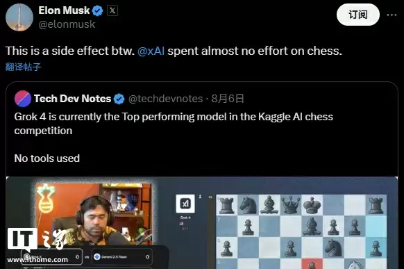 相比之下,Grok 4 在决赛前也展现了强大的实力,先后淘汰了谷歌的 Gemini 2.5 Flash 和 Gemini 2.5 Pro。当时,xAI 的创始人埃隆・马斯克曾表示,xAI “基本没在象棋上花功夫”。