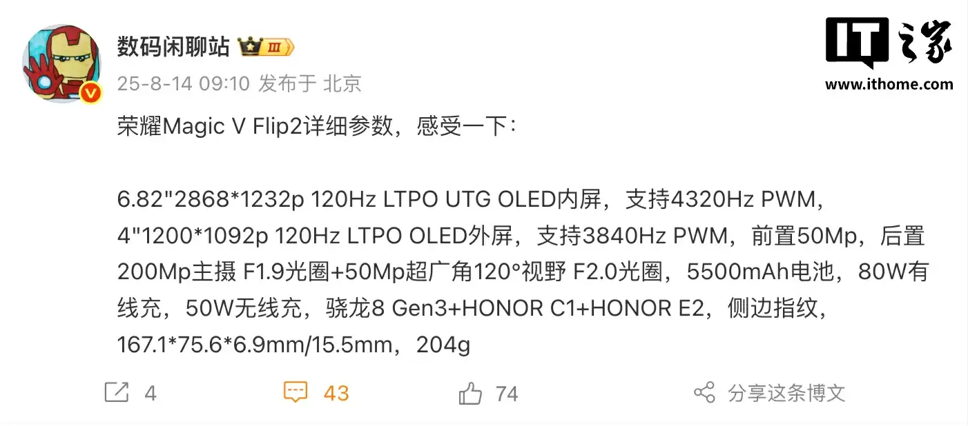 8 月 14 日消息,@数码闲聊站 今天放出了荣耀 Magic V Flip2 的详细参数信息,包括屏幕、影像、性能、电池等多方面。