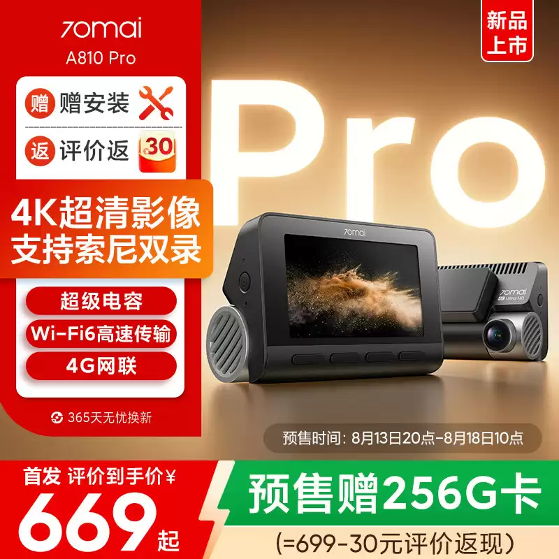 8月14日,70迈正式推出A810Pro行车记录仪,重点采用了索尼IMX678图像传感器,单录版本预售价格为699元。
