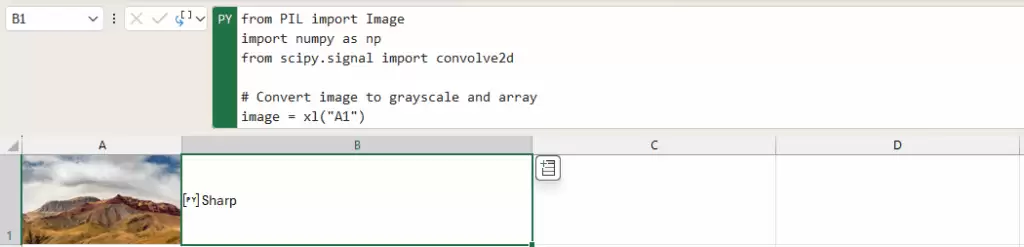 fromPILimportImageimportnumpyasnpfromscipy.signalimportconvolve2d#Convertimagetograyscaleandarrayimage=xl(“A1”)arr=np.array(image.convert(“L”)dtype=np.float32)#ApplyLaplacianfilterlaplacian=convolve2d(arr[[010][1-41][010]mode=sameboundary=symm)#Classifybasedonvariance“Blurry”ifnp.var(laplacian)100else“Sharp”