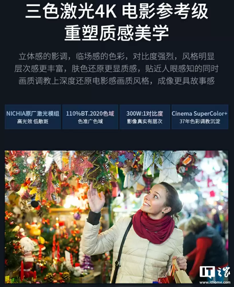 优派 LX700-4K Ultra 三色激光投影仪搭载 NICHA 原厂激光模组,支持 110% BT.2020 色域,对比度达 300W:1,使用 Cinema SuperColor+ 色彩调教方案。