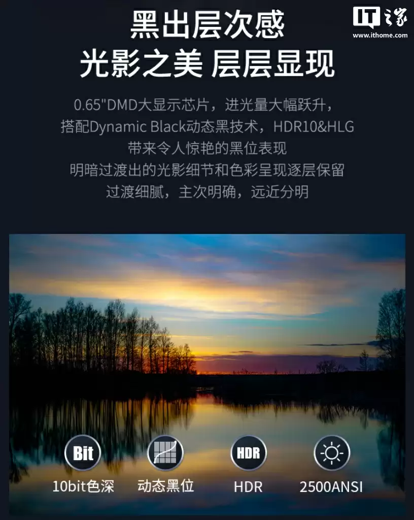 该投影配备 TI 德州仪器 0.65''DMD 显示芯片,支持 10bit 色深和 2500ANSI 流明;内置 Dynamic Black 动态黑技术,支持 HDR10&HLG;支持立体光影、动态黑位,官方称可呈现“真实景深,保留皮肤细节”。