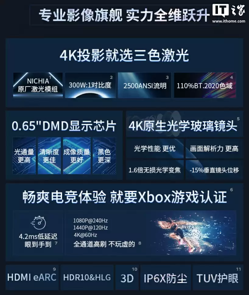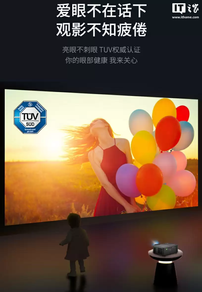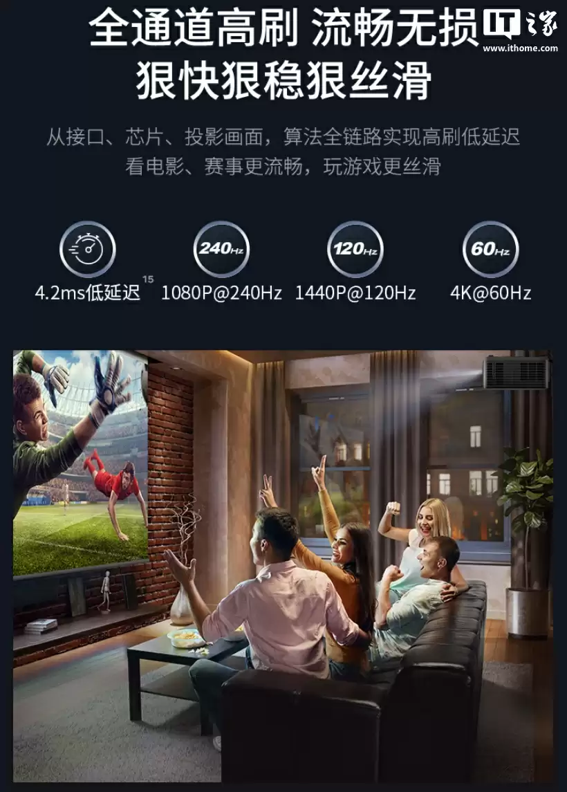 优派 LX700-4K Ultra 三色激光投影仪支持全通道高刷,最低 4.2ms 延迟,支持 1080P 240Hz、1440P 120Hz 和 4K 60Hz 显示。此外,投影还通过 TUV 认证,官方称“亮眼不刺眼”。