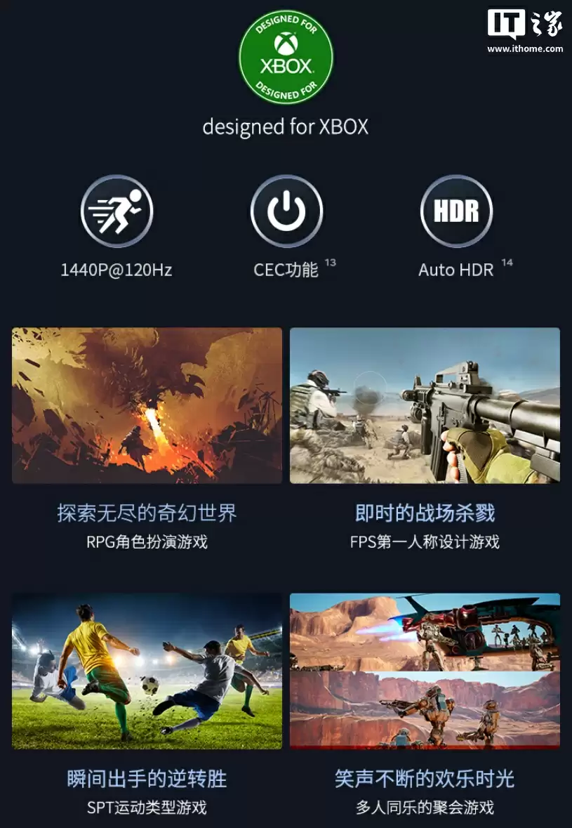 该投影通过微软 Xbox 游戏认证,内置专属游戏设计功能,支持 Xbox 1440P@120Hz 显示、CEC 控制、AUTO HDR 等功能,适配 RPG、FPS、SPT 等类别游戏。