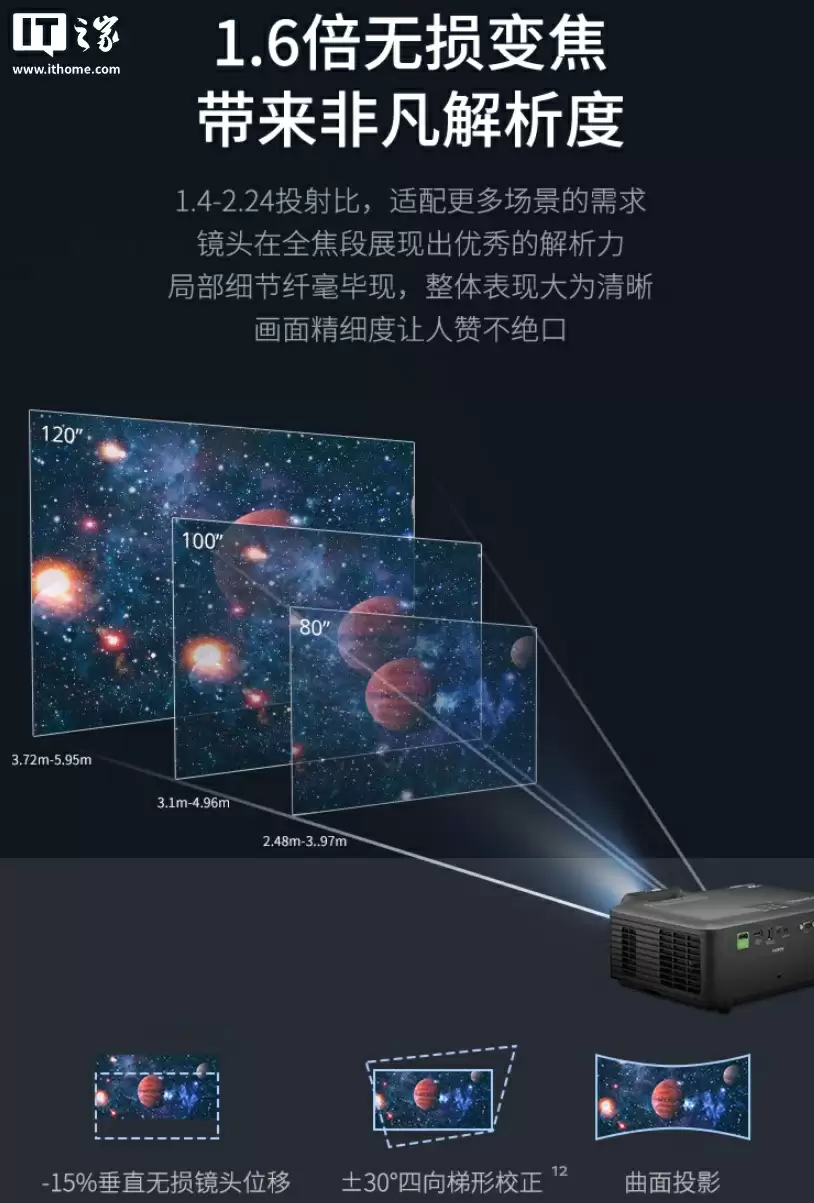 优派 LX700-4K Ultra 三色激光投影仪采用 4K 原生光学玻璃镜头,支持 1.6 倍无损变焦、1.4-2.24 投射比,可投出 120 英寸画面。同时,投影仪还支持-15% 垂直无损镜头位移、±30° 四向梯形矫正和曲面投影。
