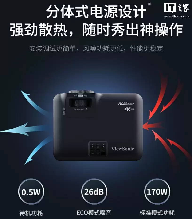 投影采用分体式电源设计,标准模式功耗 170W、待机功耗最低 0.5W,ECO 模式噪音 26dB。