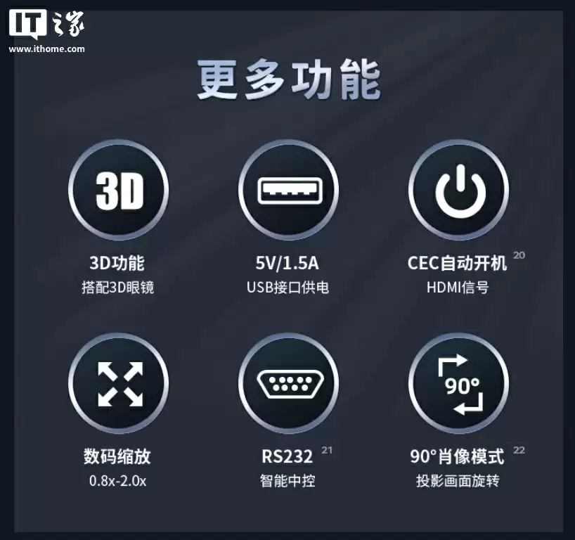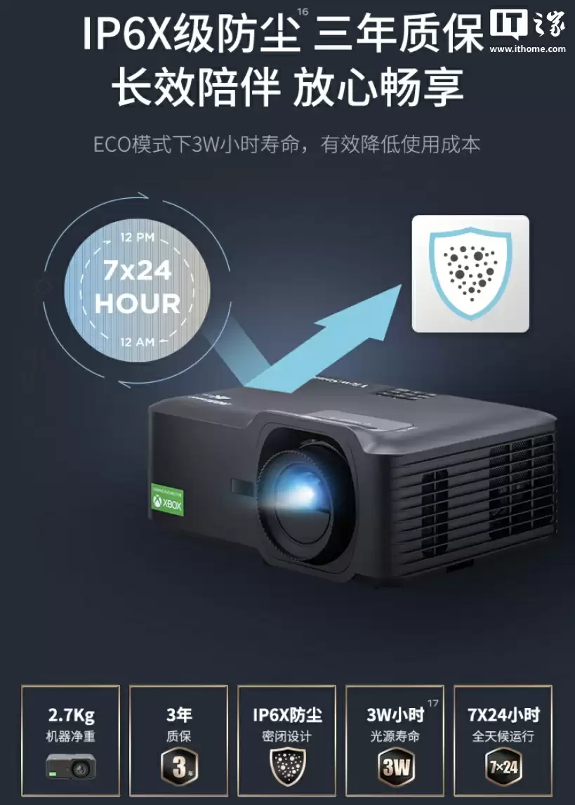 该投影整机净重 2.7kg,支持 IP6X 级防尘,三年质保,ECO 模式下拥有 3W 小时寿命。