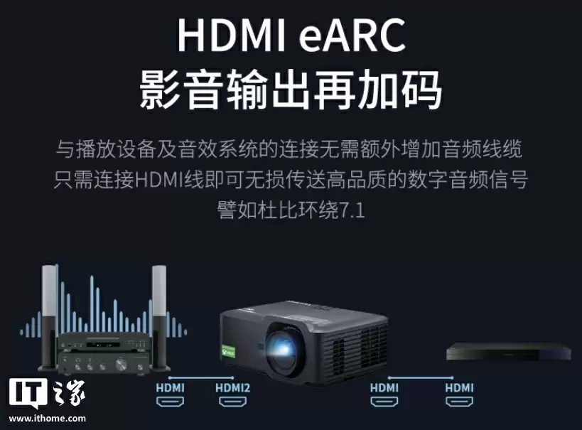 此外,优派 LX700-4K Ultra 三色激光投影仪配备 15W 扬声器,支持 12V 触发输出,可控制电动窗帘自动合上。投影支持 HDMI eARC 音频输出,用户可通过 HDMI 传输杜比环绕 7.1 等数字音频。