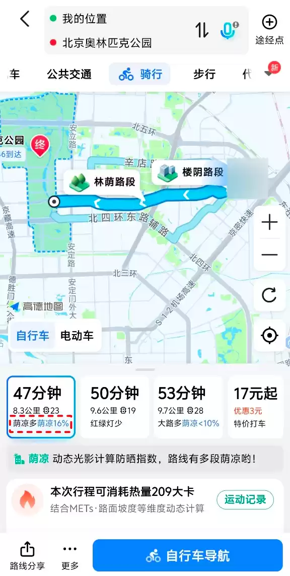 规划路线时选择步行或骑行模式,地图会自动显示路线上的荫凉百分比,清晰标注林荫路段与楼阴路段,帮你精准避开烈日直射。