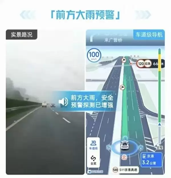 遇到突发大雨,导航界面会及时弹出“前方大雨,安全预警探测已增强”的提示,并通过语音播报实时提醒前方车距和平均车速,建议保持车距、适当减速,无需额外设置即可自动激活,为雨天行车增添一份安全保障。