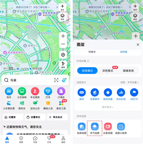 打开高德APP,点击右上角“图层”,在“百变地图”中选择“天气地图”并切换至“降水”模式,即可查看当前及周边区域的降水情况,帮你巧妙避开降雨区域,让自驾旅途少受天气干扰。