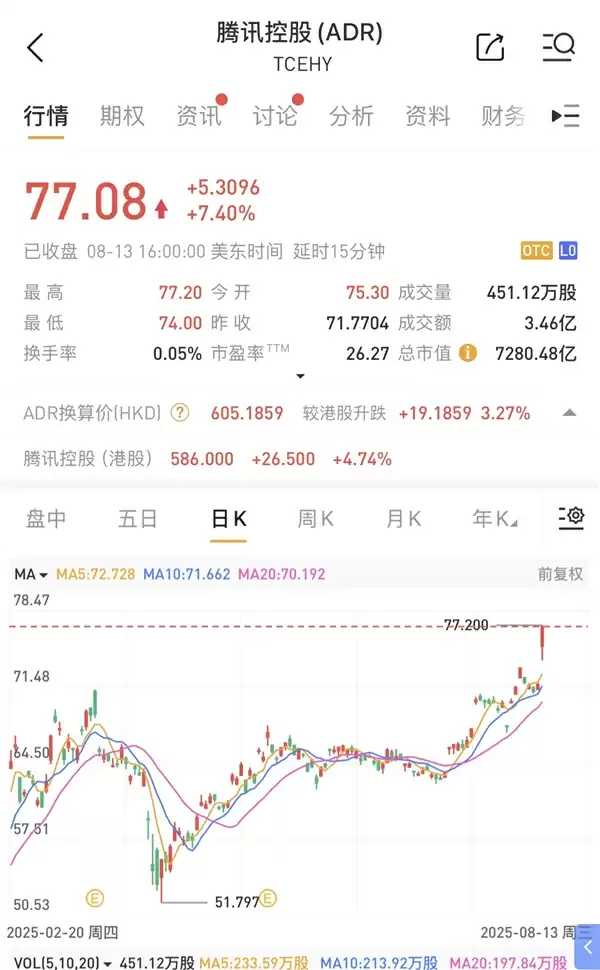 注:腾讯控股ADR即为在美国市场发行的腾讯控股存托凭证,允许美国投资者无需直接开通港股账户,即可在美股市场交易并享有相应股东权益。