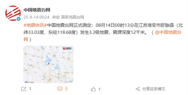 8月14日消息,据中国地震台网正式测定,今天00时13分在江苏淮安市盱眙县(北纬33.03度,东经118.68度)发生3.3级地震,震源深度12千米。