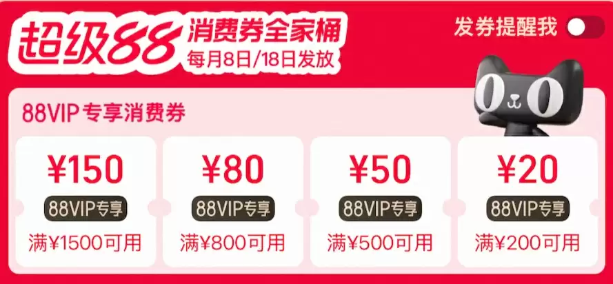 淘宝 88VIP 本月 18 日起可用“超级 88 消费券”,内含下方多重折后优惠券,非常划算: