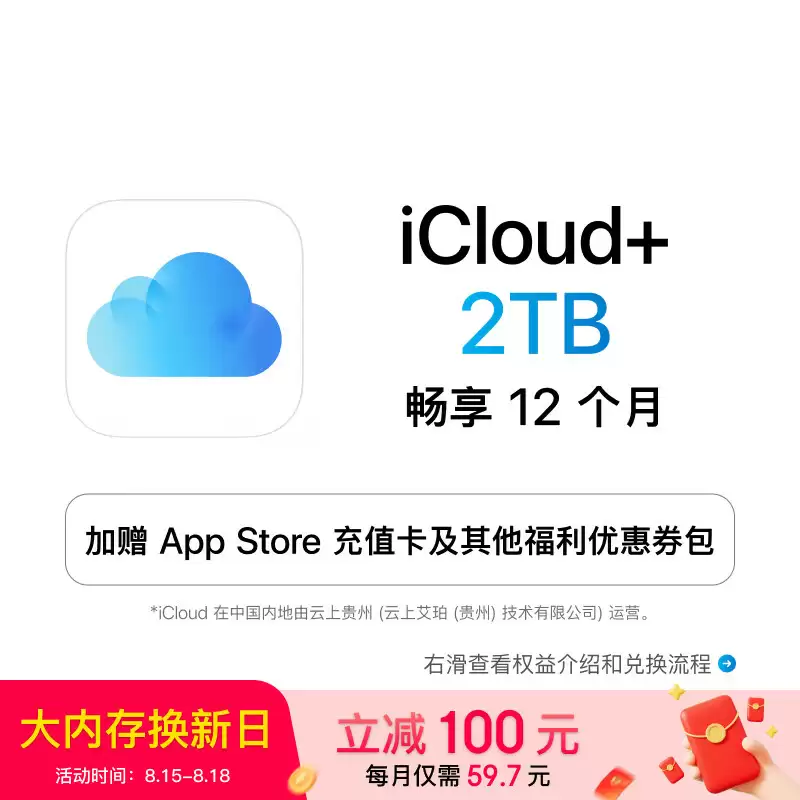 京东 iCloud+ 2TB 12 个月 68 → 59.6 元 / 月折后 716 元领 100 元券