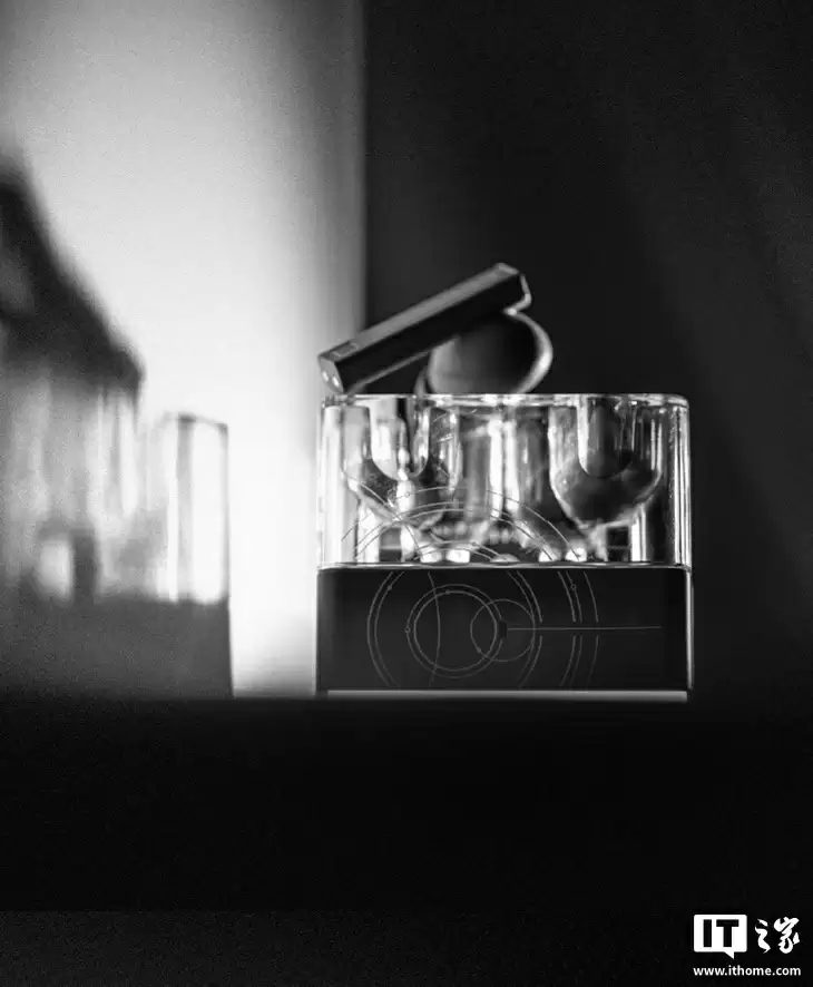 这款耳机延续了太空漫游系列标志性的设计语言,创新性地采用了透明材质耳机盒罩,搭配深灰色盒身与耳机主体,其间点缀着极具太空感的星云图案设计元素。